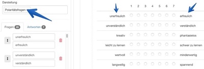 Es gibt Frageformen, in denen die Matrix zwei Pole einer Antwortmöglichkeit beschreibt. Über die Darstellungsform "Polaritätsfragen" lassen sich nun beidseitige Beschriftungen für Antworten definieren: